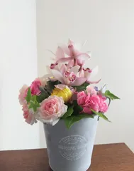 庭のお花で 鉢植えのシンビジウムが終わりに近づいてきたので部屋に飾ることに☺️それだけだと寂しいので育てているミニ薔薇、カーネーション、ココロジャンボ(帝王貝細工)その他を鉢カバーに花束の様になりました💞
