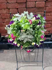 ビオラのハンギング 『ビオラのハンギング』ビオラは2種類選べたので明るい色合いで😊💕✌️白妙菊は伸びてくるので途中で切り戻すといいとのこと😁🎶ハンギングは水やりがちょっと難しいけど💦長く楽しめるよう頑張ります😆👍️❤️
