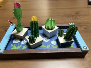 枯れないサボテン🌵 100均のペーパークラフト可愛いサボテンのキットをみつけたので、作ってみました何種類かあったのですが、先ずは4つ作ってみました難易度が3段階あって、向かって右から2つめの難易度3は、じゃばら折が難しかったですが、何とか完成!台座の端にアロマオイルを垂らすと良いとあったので、お気に入りの香りを一滴…他