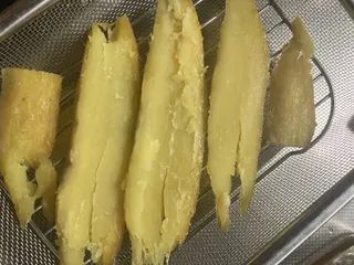 焼き芋で作ってみました 焼いて、皮剥いて綺麗にしてから、切って ザルに入れて乾かしてます。 本当は蒸して作る物なのですが、焼き芋作っている途中で気が変わったので、皮を剥いて干しています。 まだ、完成していませんが、出来上がるのが楽しみです😋