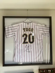 玄関と階段にお宝を すいません、オリジナルの作品といっていいかどうか不安ですが... 玄関に大好きなプロ野球選手のサイン入りのユニフォームを飾りました。 以前は違う選手のユニフォームでしたが、今回息子が沖縄キャンプ見学でサインをいただけたので付け替えました。以前はこちら、サインはもちろん