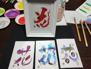彩り文字アート 先日まちゼミで彩り文字アートに参加してきました!習字なんて小中学校以来で上手く書けるか心配しましたが、くずし文字&彩りでなんとかなるもんだなって思いました! 下地文字を水分たっぷりで書かないと早く乾いてしまって別色のにじみが上手くいかないのが難しかった🥴楽しかったので、別のワークショップも