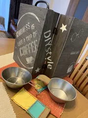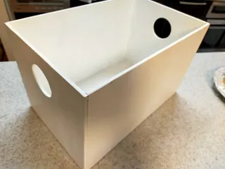 MY TREASURE BOX 作業の場所が決まってないのでアクリル絵の具を運ぶのが面倒で専用箱を作ることに。箱は100均の箱を2つ、持ち手のくり抜いてある部分には薄い板をはりあわせました。が、肝心な棚板と持ち手を買い忘れた😱今日は雪…子どもだけでなくリモートワークの人も増えたので静かにひっそりとしてないとね。とりあえず手元にある