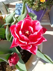 なおさん、こんにちは。m(_ _)m 八重咲きのチューリップ🌷で、縁にホワイトが有って綺麗ですね。😌🌸💕 貴重なチューリップ大切に育って欲しいですね。😌🌸💕