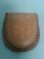 革の小銭入れ 長財布作ったあまりの革で小物作り今回は、カービングで絵を取り入れて、コバ(縫い合わせた縁)をレースかがりしています。