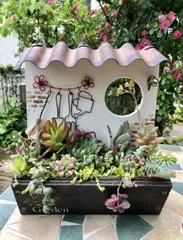おうち型多肉プランター ワークショップにて壁はホワイト、屋根はゴールドベースプランター部は超撥水ダークブラウン先週作ったおうち型多肉プランターをアレンジして寄せ植えしました🍀ステンシルとワイヤー小物を飾り付け目立たないけど屋根にニャンコも乗せました🐈⬛はじめましてのTagさんからいただいた多肉さんを詰め詰め🌱(Tagさん