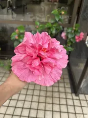 うれしい!たのしい!八重咲き! これ、ハイビスカスです🌺何年か前に売れ残っていたものを半額で引き取って来ました。本当は黄色いハイビスカスと2本植えでしたが、黄色さんは消えてしまいました💦勤務先の入り口に置いていて、花がら摘みなどしていると、たま〜に話しかけてくださる方がいて、ちょっとした会話が嬉しく、励みになります(^^)v