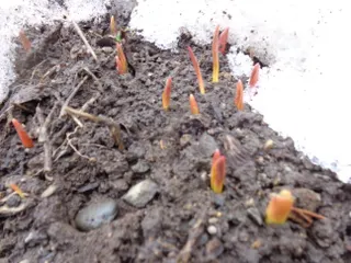 一昨日から昨日少し暖かくなった札幌なのらぁ~。といっても5℃ぐらいだけどね。それでも少しづつ雪どけが進み、ちょっとだけ、雪のすき間から土が見えてきました。そうして、良く見てみると小さな芽がニョキッと出てましたよー(^^)だーれだぁ~?おっと🌷チューリップ君達ではありませんか。今年も出てきたんだね。嬉