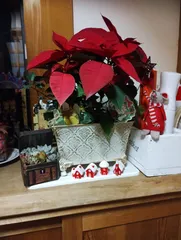 ごちゃごちゃな玄関を、せめてクリスマスムードに😁 ポインセチア、去年のものも生きながらえているので、ちょっと世話してあげないと。。。