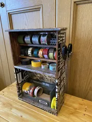 男前✨マステディスプレイ収納😉🎶 boxにカインズWSのを参考にして切った角棒をペイントしてはめ込みました😊🎶これでマステが取り出しやすいですねー👏中は鉄板風リメイクシートなどを貼りサビサビしてブルックリン風に🤙屋根瓦風にレザーをカットして貼り、サビ加工〜❣️ハサミ立てに100均のフックを使いました、もちろんサビサビしました〜😃‼️