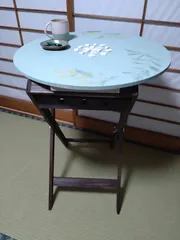 アレンジアワード2022 初めて作ったタオル掛けをテーブルにしてみました。丸いボードに色を塗り、アクリル絵の具で大好きなミモザの花を描き、中央にパステルカラーのタイルを割って貼ってみました❢