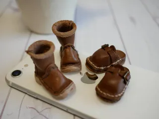 ミニチュアの革靴 本革でミニチュアのロングブーツとサボサンダルを作りました。 手縫いの後、革を水で濡らし形を整える時に、内側から何度も押してつま先に丸みを帯びるようにして本物に近づけました。サボサンダルは金具のミニチュアが可愛いポイントです♪