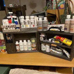 ありがとうキャンペーン 昨日カインズWSで作ったトランク風小物ケースに塗料や筆を入れてみました。ずいぶん見やすくなって、ますますDIYが楽しくなりそう!😆✌️後ろから見た、手描きイラストとステンシルコラボのROUTE66もなかなかいい味出してるなぁ✨