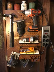 有孔ボードラック 工具を見せる収納で、有孔ボードを使いラックを作りました。扉になっており、中にはペイントを入れられる仕組みにしてます。見せる収納と隠す収納のコラボです♫