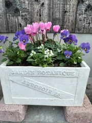 寄せ植え🌿🌸 自家採種した種蒔きビオラで、寄せ植え🌿🌸 シクラメンは購入しましたが、白のアリッサムもこぼれ種のものです😄 ビオラは8月初めに催芽処理。発泡スチロールの箱に凍らせた牛乳パックを入れて、18℃前後で温度管理をして発芽させました🌱 9月にポット上げして、100ポットくらいは