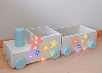 汽車型プランターカバー WS作品の【汽車型プランターカバー】自宅にてアレンジさせて頂きました🏠🎨プレゼント仕様のペイントでネーム入りの為、スタンプで見にくくて|ω・`)スミマセン100均のマグネット2種類使って連結🧲既にプレゼント済みで、お子ちゃま👶🎀のオモチャ入れに使って貰ってます🥰