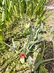 もうチューリップが先はじめました! 今頃に咲くなんてびっくりです!!赤い方は茎も伸びす蕾が顔をだしもうすぐ花弁が開く感じです!こんなの初めてです???