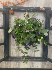 昨日のグリーンワークショップの作品です🎵初めてのハンギングバスケットづくりもう~楽しかったです😆⤴15ポット➕2ポットまぁるくするのにどこに何を❗バランスよく❗色が重ならないように❗これがホントに難しい😓 先生の魔法の手直しで可愛く出来上がりましたが🤗下過ぎたり、くっつき過ぎたりバランスが