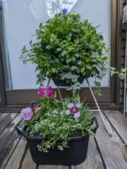 コーナンの寄植えバイキング行ってきました。 午前の部、2箇所のハシゴ😂 1箇所目は550円で3+1(ライン友達)パンジー、ビオラ、白妙菊、キンギョソウ、ナデシコ、ポリアンサ、小粒の花?8寸くらい丸浅プラ白orブラウン 2箇所目550円と880円がありました。880円を選択。ハンギングバスケットが楽し