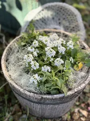 お嫁ちゃんがバザーでもらって来たビオラ7個。徒長していたのでチョキチョキ✂️切って😵💦色が分からん😭しまったぁ〜とりあえず家にあった物🪴で二鉢作りました😅ふぅ💨ボロ隠しに“ポヤポヤ”を入れて🤭