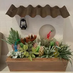 おうち型多肉プランター 少し前、久々にDIYのワークショップに行くことが出来て作成したのですが植物のお世話が上手くできない私。度々100均をのぞいてはフェイクを。 昔もっと100均に多肉フェイクあったのに今ほとんど見かけなくなってしまい何店舗も回って、更にABCクラフトも行って何となくそれらしい色合いのを集めたけ