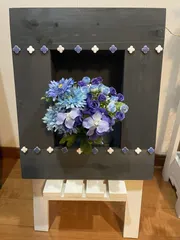 フラワーフレーム 今日はフラワーフレームを作ってきました♪ 色はアイアンブルー🫐にしました☺️タッカーで止めた後が気になり、前にも使ったタイルを貼ってアクセントにしてみました💖 今日も楽しいワークショップありがとうございました🥰タイルない方がシンプルでいいかなぁ🤔タイルは両面テープで貼ってあるので