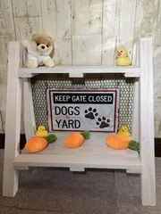 A型ステップラック ワークショップで作成したステップラック下段に工作ネットを貼りブリキ看板を付けてみました。