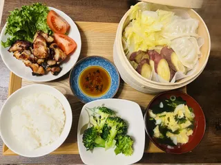 アタシがお粥苦手なので、至って普通の夕飯の我が家🤣夜勤明けなので、あまり凝ったものは作りたくないのでそういう時は蒸籠の出番。餃子と野菜の蒸籠蒸し、グリルチキン、ブロッコリーのオリーブオイル白だし焼き、かき玉汁です💕ちょっと焼き過ぎた🤣
