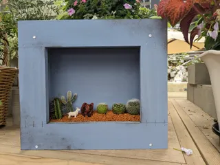 立て掛け額縁のサボテン植え (ou) 本日は東京遠征中。さてメインのワークショップである青梅インター店でのワークショップに行ってきました。このところ多肉植物が多くなってる気もしないでもないですが、またサボテン植えを作ってきました。本日はキャンセルの方が多く、マンツーマンでのワークショップとなりました。 時間にして1時間ちょっと