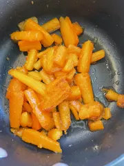 お試しのニンジンのグラッセ 先程作品投稿したニンジンで、グラッセを作ってみました。デリッシュキッチンのレシピを参考にして、約300gのニンジン量だったので、それに合わせて調味料も多めにして。面取りは省いて収穫したのを全部。煮立ってきました。もう少しで水分が蒸発か?正直なところ、このグラッセは失敗でした。ニンジンが若すぎたのかな