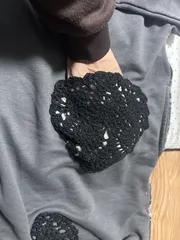 最初は大きめのモチーフ貼り付けただけでしたが着ててポケットにした方がいいと気が付いたので😁写っている布団カバーと同じ布を当て布にしてポケットに💖