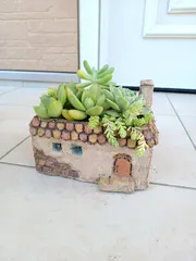 7月に大分の『土の屋 』さんのレッスンで作ってきました(^^) 壁の色の出し方や細かい屋根の作り方など、すごく勉強になりました! 100均の多肉が、この暑さでだいぶお陀仏しちゃってました😭もっと早く植え替えしてあげなきゃでした・・・ いちばん右は以前土の屋さ