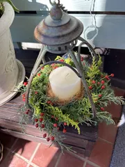 あめちゃんさんの真似っこをしてキャンドルリースを作りました🕯️このバードフィーダーにピッタリあってとっても素敵な作品ができました😍去年までは大きいお皿にオアシスを置いてグリーンを挿して真ん中にキャンドルを乗せたものを作っていましたがこれだとコンパクトでいい感じです💕WSで植えた多肉ちゃんが⭐️になっ