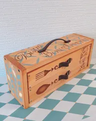 WS作品の【持ち運び便利なカトラリーケース】自宅にてアレンジさせて頂きました🎨🏠箱底部分にシート敷いて取手が付けてあるケースの裏側に100均の合板をカットしてビス留め。引出しも出し易いように100均の合皮を持ち手としてビス留めしました。カトラリーケースとして使うのでソレっぽくステンシルぽんぽん♪̊̈