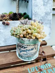 ワッペンを付けたリメ缶に多肉寄せ 可愛いつぶつぶ多肉さんをお迎えしたので、久しぶりにリメ缶を作成しました😆私にしては、ちょっとお高い苗…😅前に作ったB&Bステンシルコースタープランターのつぶつぶ多肉寄せと並べてみました🤭可愛いです🥰