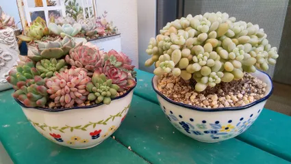 ダイソー食器に寄せ植え ダイソーの食器、ボウルに穴あけして植えました☺️1つは寄せ植え(左)もう1つは1ポットを植え替えただけ(右)ですキャビアという品種で何本も植えてあるのですが、1本の木みたいに見えて、気に入ってしまいました😆この木何の木気になる木~🎶 どちらも山盛りの多肉になりました!