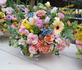 フラワーアレンジ お花のアレンジ教室に参加してきました。種類もたくさん。葉ものもたくさん。バラ、トルコキキョウ、ガーベラ、スイトピー、カーネーション、アストランティアチューリップなど、たくさんの花の香りに包まれて贅沢な時間でした。😆💕ミモザもとリクエストしたらプラスしてくれてボリュームのある作品になりました。とても幸