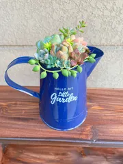 DAISOさんで購入したジョウロ(¥220)が可愛かったので、底に穴をあけて鉢にしました😊この鮮やかなブルーはきっと多肉さん🪴が映えるに違いない‼️もりもりぎゅうぎゅう詰め込んではぁー、やっぱり可愛い╰(*´︶`*)╯❤️❤️こちらもイベントに持って行きます♪♪♪