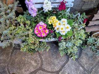 わぁ💕 素敵な迎春💝 いいですね〜葉牡丹高い子もいる😁 右のミント似の子はいい色ですね。 赤の金魚草も南天?もお祝い色で👍