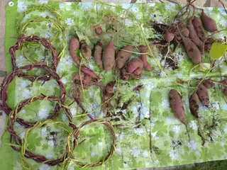 さつまいもの収穫🍠 春に植えた紅はるかとハロウィンスィーツ、2種類のさつまいも🍠大小50個弱収穫しました🥰きれいに分けて植えて収穫したのに、主人と子供に移動を頼んだら、ごちゃごちゃに…😱素人の私には見分けがつきません😭調理してからのお楽しみかな。 つるはリースにしたので、どんなリースにするか考え中です🥳&nb
