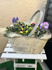 マルシェで買ってきたお花 昨日、鴻巣フラワーマーケットに行って全部100円だったお花たち🌼.*寄せてみました。ブリキのバスケットはサビサビが気に入って300円で飛びついちゃいました✨✨✨かなり深いので土も多量になるし重たくなるので半分くらいは発砲スチロールをバキバキに割って入れました😂ウチ、日当たりが悪いから元気なくなったら