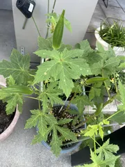 やっと人並みに… 少し涼しくなってくると野菜のなりが良くなりました。オクラが一気に四つもなるなんて🥰しばらくの楽しみです!