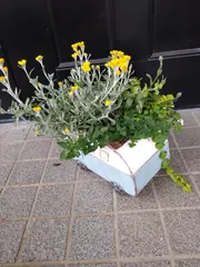 寄せ植え追加 以前GWで植えた、上の画像のピンク色の花が根腐れ起こしたようで、なくなってしまい、空間が空いてました。今日のGWの時先生に相談させて貰ったら、追加して植えてもいいと言われたので、暑さ病気に強いとラベルに書いてあった物を早速カインズで購入。今はまた、葉だけですが、さくのが楽しみです