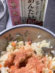 明太子ポテトサラダ 明太子ふりかけを使ってポテトサラダを簡単に作りました🤭野菜がないので千切り大根を並べて😅ポテトも人参も甘いです😁塩は入れず胡椒少し