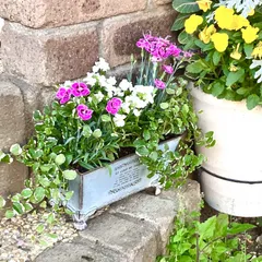 脚付きブリキの寄せ植え🪴 今回は両手に乗るサイズのブリキに寄せ植えをしました🪴今まで、GWSの寄せ植えで使用した鉢は、比較的大きいサイズが多かったこともあり、ブリキの器を初めて見た時は、少しコンパクトな印象でしたが…。プミラを鉢からこぼすように植えると、可愛らしく華やかな寄せ植えになりました🌱(右側の白い鉢は、12月にGWS