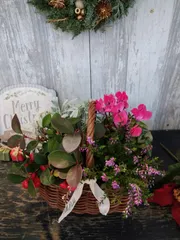 10月の寄せ植え 鶴ヶ島店のGWSに参加しました。ガーデンシクラメン、チェッカーベリー、這い性カルーナ、モクビャッコウをカゴに植えました☺️フォトコーナーはもうクリスマス仕様でした🎄