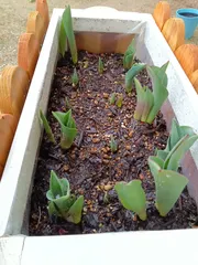 チューリップの芽が顔を出しました。でも赤くて(^_^;)恥ずかしそうな様子🌀 ちょっと早かったかしら?と言っているようで、何だか可愛いと思いました💕