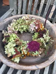 秋の彩りリース🍂 中之条ガーデンズ内赤い小屋にて🍎 秋の彩りリースを作製しました🍂こちら完成したナチュラルリースです😊 材料がたくさんにありどれも使いたい💕と思ってしまうほどの素敵なドライフラワーや草花🪻 ノリウツギとアナベルのみ使ったリースもステキだったのでここで完成とする