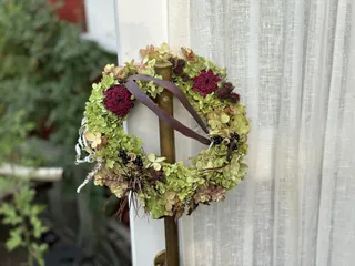 中之条ガーデンズ内赤い小屋にて🍎 秋の彩りリースを作製しました🍂こちら完成したナチュラルリースです😊 材料がたくさんにありどれも使いたい💕と思ってしまうほどの素敵なドライフラワーや草花🪻 ノリウツギとアナベルのみ使ったリースもステキだったのでここで完成とする