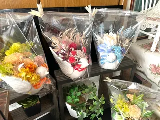 旅立ちに向けて・・・🍀🕊 年明けのワークショップにてお世話になった先輩方が退職されるので感謝の気持ちを込めてお花等を選び作りました🌸 不器用な私には繊細な素材に悪戦苦闘でした💦包装の仕方もこんなん!?って感じかもしれませんが一生懸命な結果です🤕 先輩方のご多幸を願いまして…💝あと鳩さん達もお元気でね ☺️